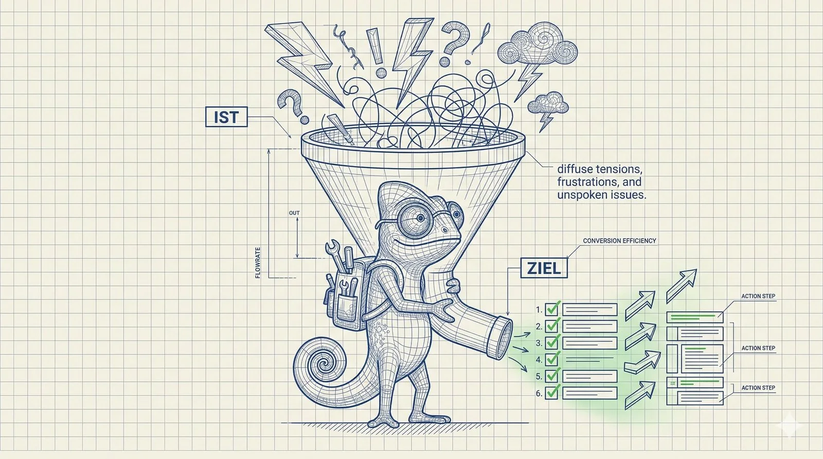 Dem Ansatz zugrunde liegt das Verständnis, dass jeder (Veränderungs-)Impuls (ja, auch Meckern!) wertvoll sein kann, solange es ein geeignetes Setting gibt, das diesen Impuls aufnehmen und konstruktiv bearbeiten kann.