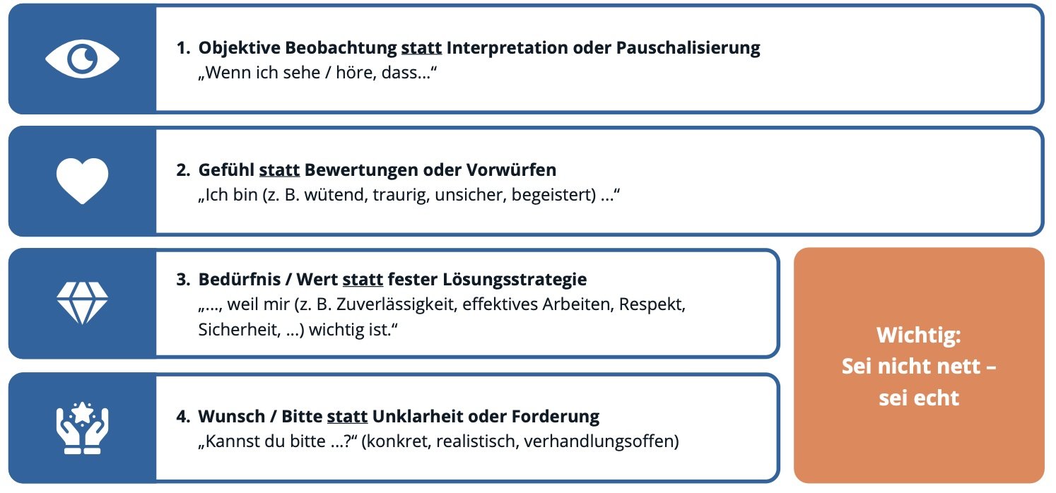 Kommunikation mit chirurgischer Präzision: Die saubere Trennung von Beobachtung, Gefühl, Bedürfnis und Bitte ermöglicht es, kritische Themen und Konflikte anzusprechen, ohne defensive Schutzmechanismen („den Elefanten“) auszulösen. Es ist das Werkzeug für Klarheit ohne Verletzung.